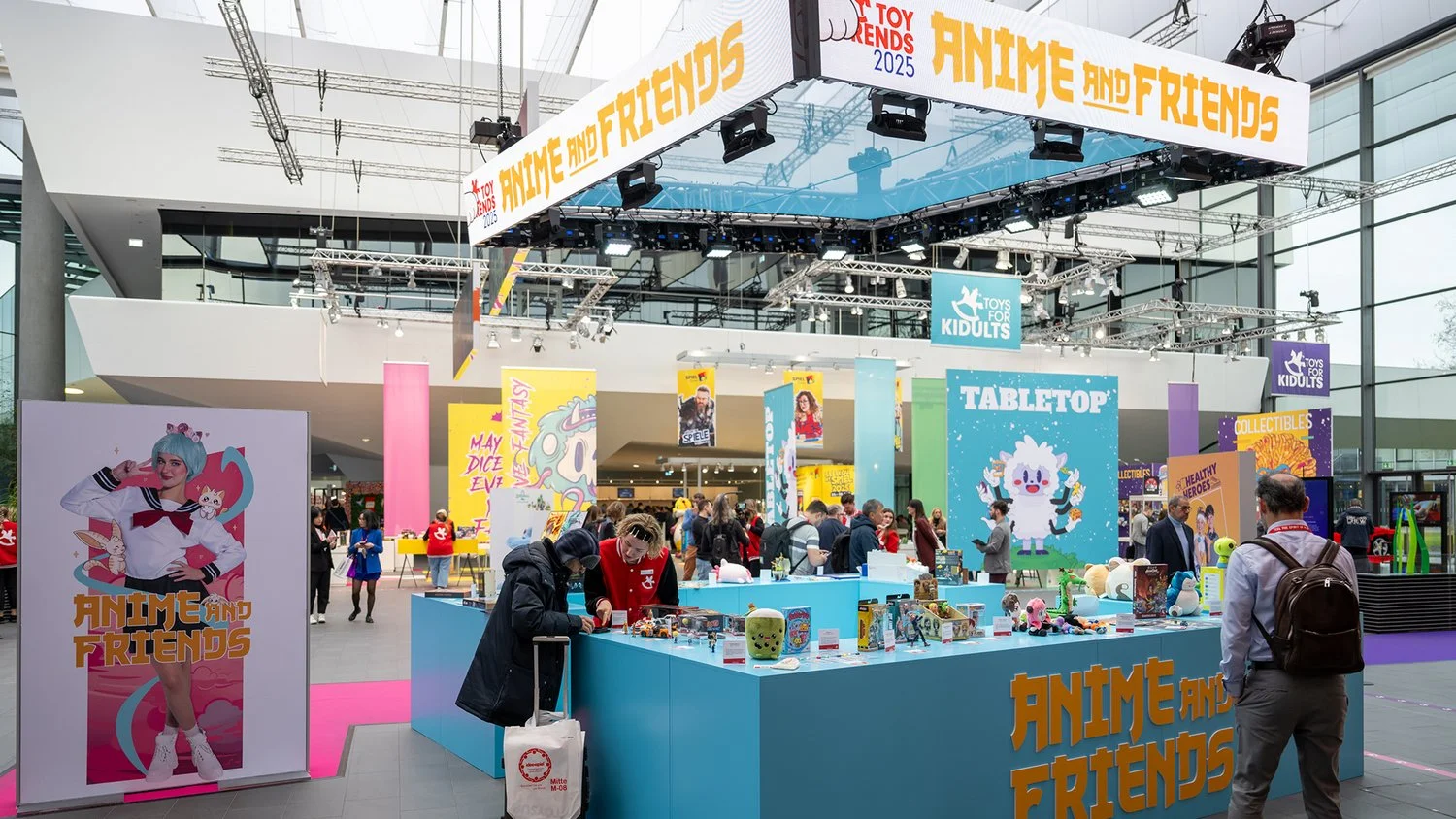 ToyTrends 2025:位于中央入口的趋势展区,以"Anime & Friends"和"Healthy Heroes"为核心主题,通过互动装置诠释年度流行方向。